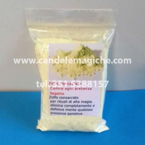 Azufre o Zolfo consacrato serve per togliere negatività e presenze occulte, da bruciare su carboncino o impiegare in ritualistica. Bustina 12/15 g.