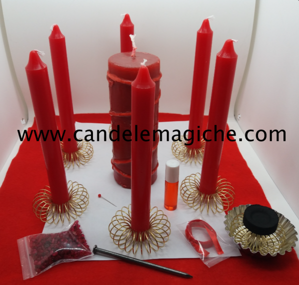 kit: istruzioni, 6 candele rosse, 1 velon legamento, essenza, incenso, carboncino, piattino bruciaincenso, 6 portacandele, fiammiferi, spillo rosso, chiodo, stoffa e nastrino rosso, tovaglietta.