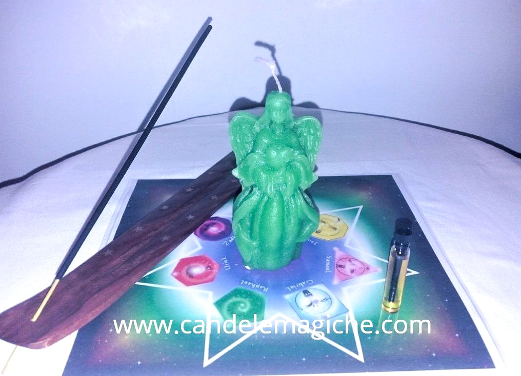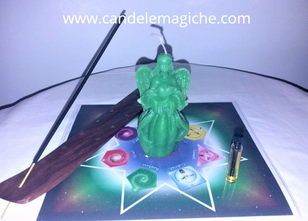 Kit: istruzioni, candela figurata Raphael, incenso, essenza, tovaglietta plastificata.